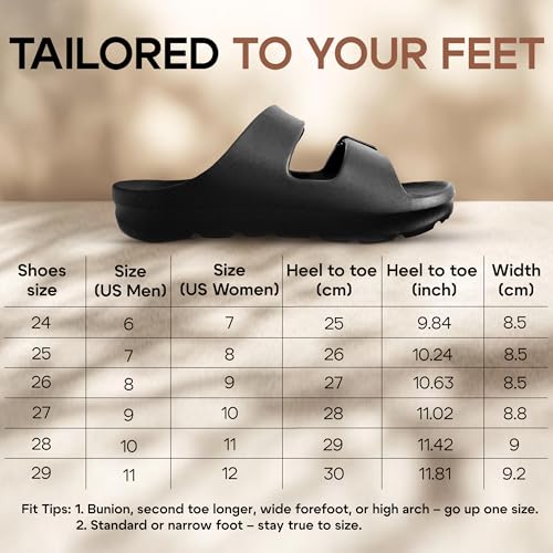 • TAILORED FIT FOR MEN AND WOMEN—With an inclusive size range and a wide-foot-friendly design, these sandals adapt comfortably to high arches, wider feet, and varying instep heights. Check our detailed size chart to find your perfect fit