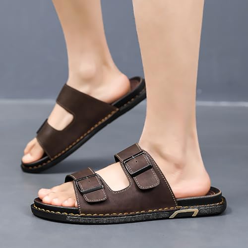 Men's Leather Flat Slides Sandals with Adjustable Buckles Casual Comfort Open Toe Anti-Slip Soft Sole Slip On Slippers for Summer Indoor Outdoor Walking Beach Sandals 7