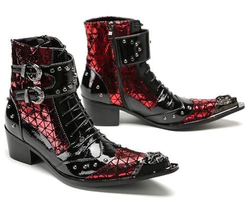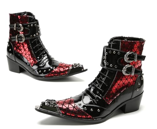 HOT ! Santimon Men's Gothic Punk Buckle Western Cowboy Boots – Genuine Leather Metal Spiked Toe, Lace-Up Ankle Boots with Buckle & Studs for Club, Party, Stage
