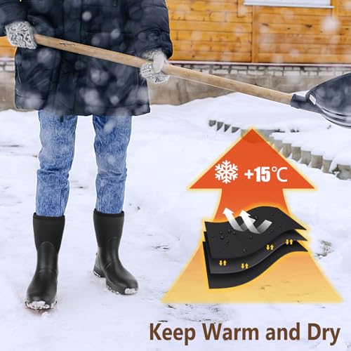 • 【Keeps Dry and Warm】The rubber boots with stretch-fit topline binding snug calf to keep warmth in and cold & snow out. Keep your feet warm and dry even in the wettest situation. Comfort Range of the rubber work boots: Sub-freezing to 65°F / 18°C. Feature with the kick tab on the back of the men's mud boots and the rear pull-loop make them easy to get on/off.
