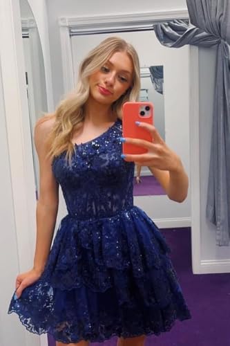Teens One Shoulder Sequin Homecoming Dresses 2025 Sparkly Tiered Lace Short Prom Dresses A Line Cocktail Dress 5