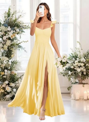 Spaghetti Straps Bridesmaid Dresses for Women with Slit Chiffon Pleated Sweetheart A-line Long Formal Dress 4