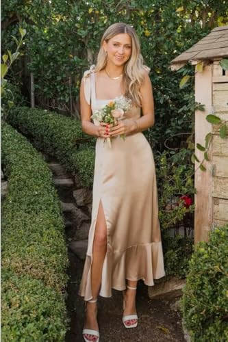 HOT ! MAGGCIF Satin Bridesmaid Dresses for Women with Slit Bow Straps Square Neck Formal Wedding Guest Evening Gowns