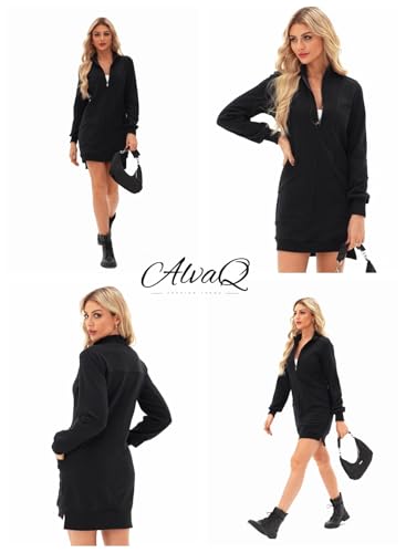 HOT ! AlvaQ Sweatshirt Dress for Women Fall Winter Casual Long Sleeve Half Zip V Neck Pullover Tunic Tops Mini Dress with Pockets