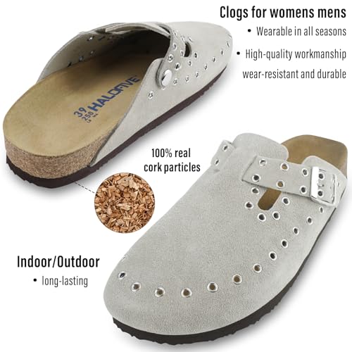 More information about Women's Suede Clogs Leather Mules Cork Footbed Rivet Potato Shoes with Arch Support Men's Comfort Slip-On Clogs