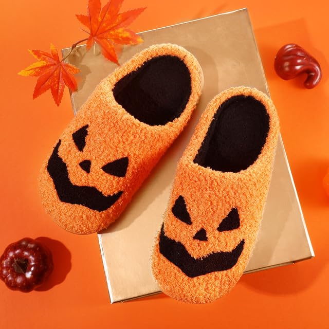 HOT ! Feionusin Halloween Pumpkin Slippers for Womens Mens Plush Warm Spooky Lantern Pumpkin Slippers Fuzzy Cozy Winter House Bedroom Slippers Halloween Gifts