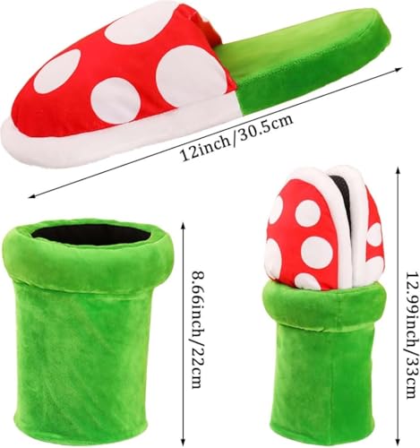 • Quirky Design: These slippers resemble the iconic Piranha Plant from the Super Mario franchise, featuring a red and white polka dot mushroom cap and green pipe stem.