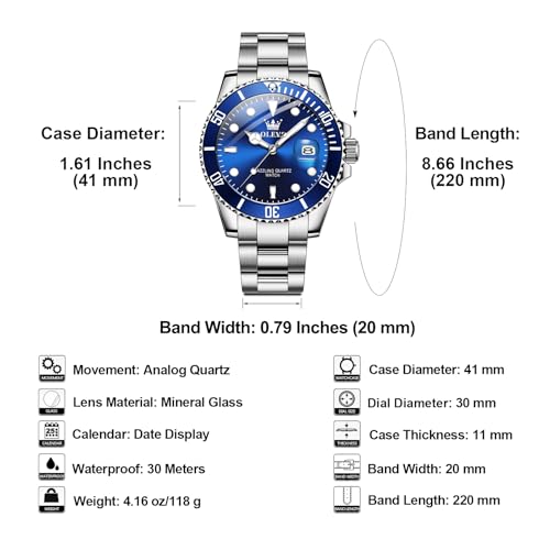 • Classic Design: Inspired by traditional dive watch aesthetics, OLEVS men's watch features a striking blue dial, 41 mm silver-tone case, a magnified date window, and large hands. This sophisticated watch offers both style and functionality, seamlessly complementing your wardrobe.