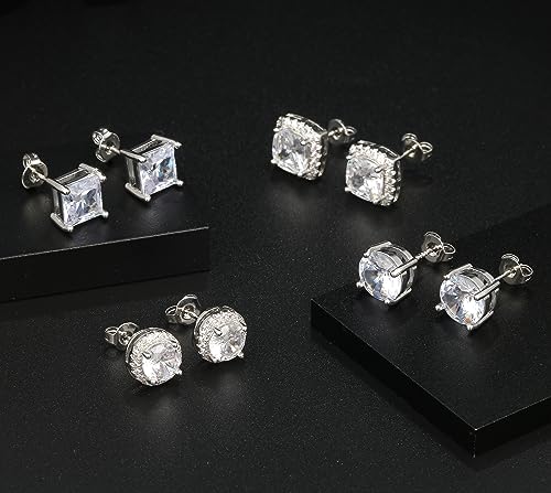 Cubic Zirconia Stud Earrings for Women Mens Earrings Hypoallergenic Sterling Silver Post Square CZ Studs Set 6