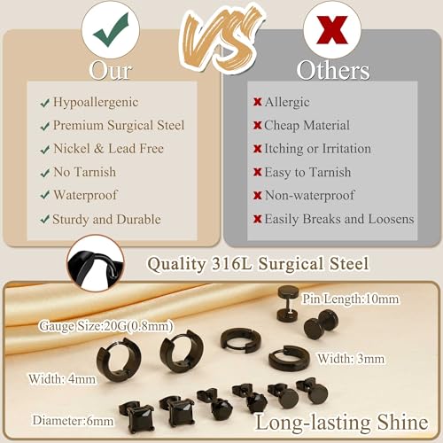 • SIZE: Hoop Earrings Gauge: 20G(0.8 mm), Stud Earrings Gauge: 18G(1 mm); Grooved Friction Post for Secure Fastening, Easy to Adjust, Convenient to Put On and Take Off; Suit for Both Men and Women.