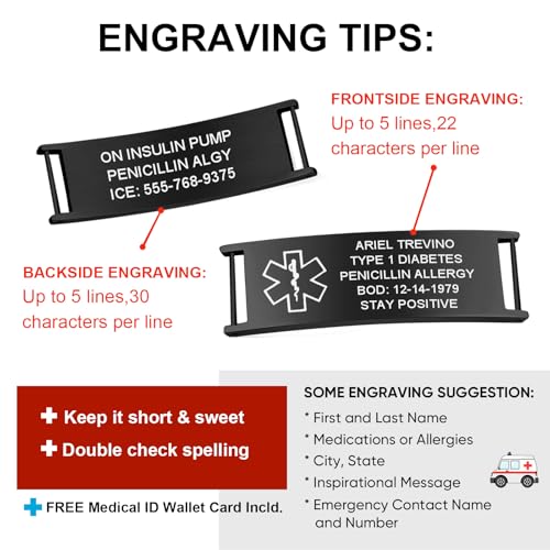 • Our recommendations: Your First and Last Name, Medical Condition(s), Treatment Considerations, Food and Drug Allergies, Life-Saving Medications, Emergency Contact Number with area code, etc.