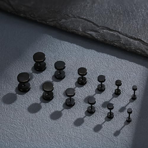 FIBO STEEL 6 Pairs Stainless Steel Black Stud Earrings for Men Women Faux Gauges Ear Tunnel Fake Gauge Earrings 3-8mm 1