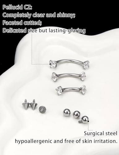 • ❣There Are 11 Pieces of Body Piercing Jewelry in the Velvet Bag. It Encompasses 3 Pieces of AAAAA+ Cubic Zirconia Eyebrow Piercing Jewelry, 4 Round Piercing Balls, and 4 Conical Piercing Spikes.