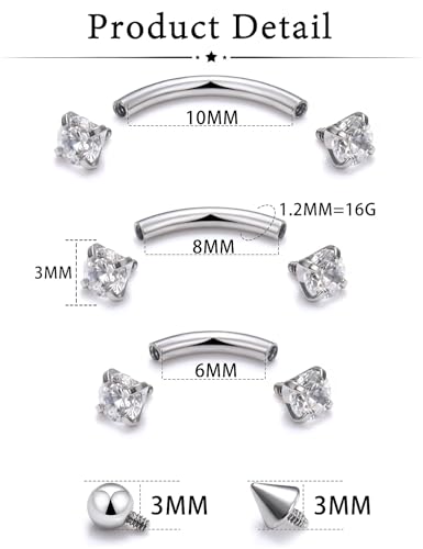 Oufksiyy Eyebrow Piercing Jewelry Surgical Steel Internal Thread Curved Barbell Tiny Eyebrow Ring Vertical Labret Lip Jewelry Ear Rook Small Belly Button Ring for Women Men 16g 6mm/8mm/10mm 3
