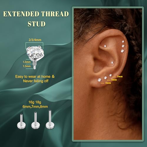 • Details of Dainty Flat Back Earrings Studs Set : These flat back stud earrings are made of G23 titanium and AAAAA+ cublic zirconic, includes 3 pairs posts (bar Length: 6mm 7mm 8mm), 3 pairs different size of thread top(top size: 2mm 3mm 4mm), 1 pc piercing taper insertion pin, and post thickness: 16G (1.2mm)