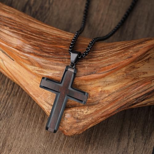 HOT ! Wooden Cross Necklace for Men, Hand Polished Ebony Inset In Black Stainless Steel Christian Mens Cross Pendant Wood, 24" Round Box Chain