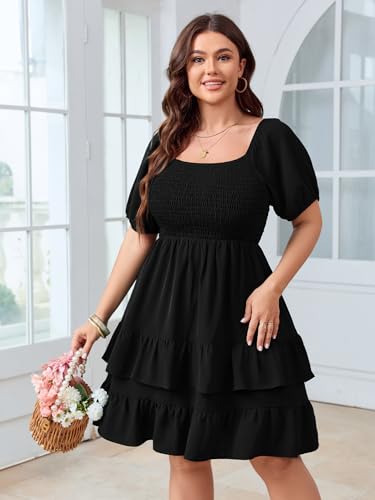 Womens Plus Size Summer Dresses Tiered Square Neck Short Sleeve Smocked A Line Ruffle Layered Swing Short Mini Dress 1