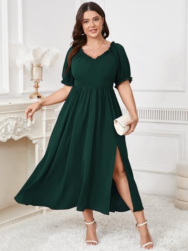 SCOMCHIC Women's Plus Size Wedding Guest Dresses Cocktail Formal Summer V Neck Puff Short Sleeve Slit A Line Maxi Dress 4
