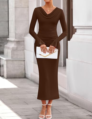• Fashion Design: The tight long dress features fashion cowl neck, bell long sleeves, ruched design at waist, back slit and maxi length, elegant and sexy to wear for all occasions and makes you more sexy, beautiful and charming, great as wedding guest dress, formal cocktail party dress, brunch or dinner dress, birthday dress, night out dress, business casual outfits, work dress and more.