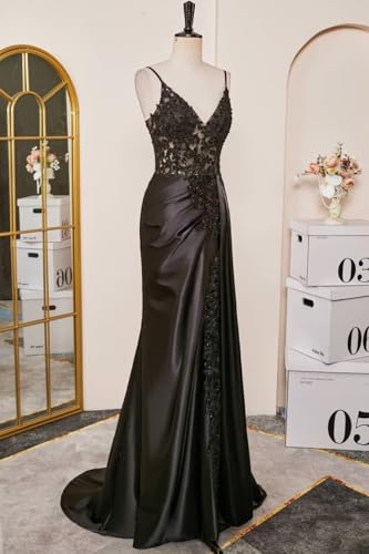 More information about Zeeyecie V-Neck Satin Prom Dresses Lace Applique Spaghetti Straps Mermaid Beaded Evening Formal Ball Gowns with Slit