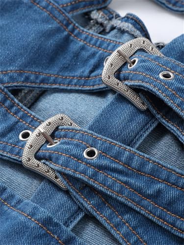 More information about Women Deep V Neck Backless Denim Mini Dress with Buckle Detail Sleeveless Trendy Summer Streetwear Dress