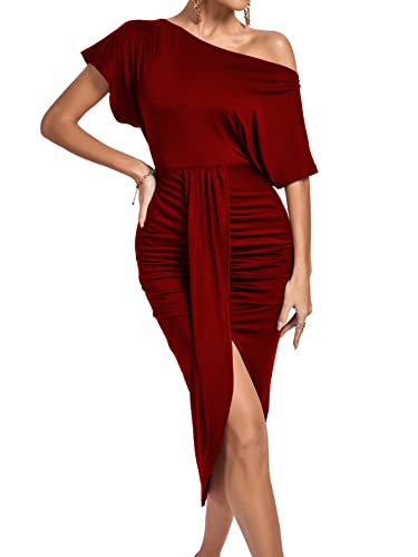HOT ! LYANER Women's One Off The Shoulder Ruched Wrap Front Split Hem Draped Party Midi Dress