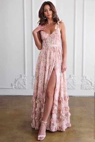 Bow Straps Chiffon Prom Dress for Women Long A Line V Neck Floral Formal Evening Party Gowns with Slit 1