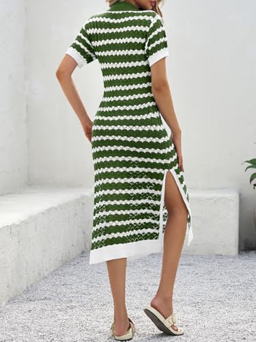 Saodimallsu Womens Striped Summer Dresses V Neck Collared Short Sleeve Loose Knit Slit Midi Sweater Dress 4