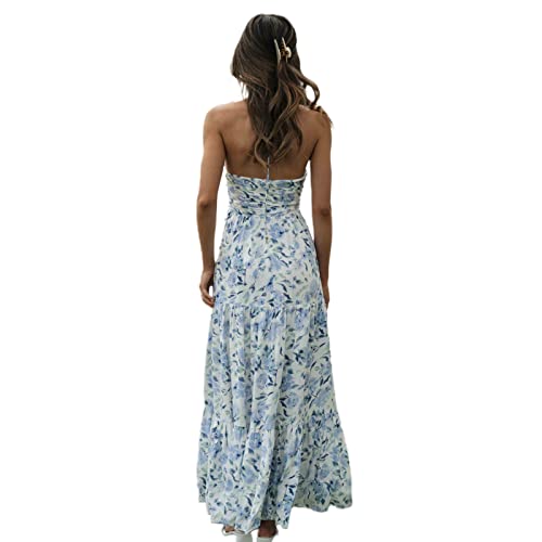 HOT ! Women Floral Halter Neck Maxi Dress Summer Tie-Up Sleeveless Backless Long Dress Flowy Ruffle Sundress
