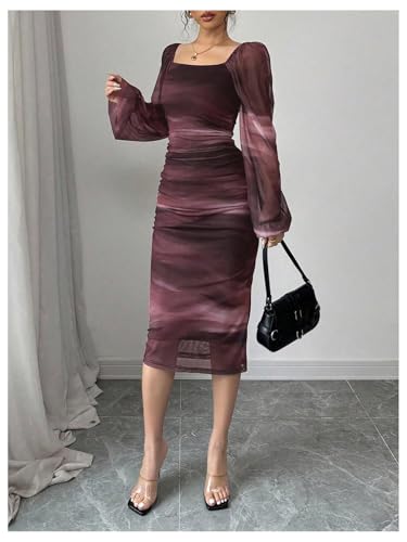 GORGLITTER Women's Tie Dye Bodycon Mesh Dress Lantern Sleeve Square Neck Ruched Party Midi Dresses 3