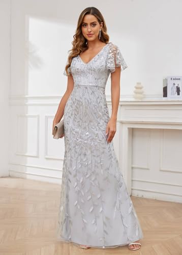 • Features:Short ruffles sleeve, sequin and tulle, embroidery, V-neck, mermaid, high waist, floor-length, built-in-bra,mermaid maxi dress for women