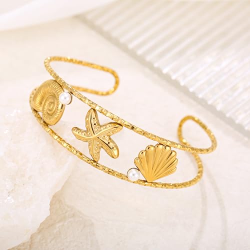 Gold Starfish Seashell Coach Cuff Bangle for Women Ocean Theme Bracelet Summer Jewelry 1