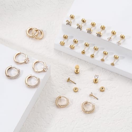 • Earrings Sets for Multiple Piercing: Including 8 pairs flat back stud earrings and 4 pairs smooth/cubic zirconia hoops. Hypoallergenic Stainless Steel Stud and hoop earrings set for multiple piercings, such as cartilage earring, helix piercing, first hole, second hole, third hole, tragus piercing, etc.
