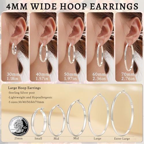 LOUMILEO 4mm Wide Large Silver Hoop Earrings Lightweight 925 Sterling Silver Hoop Earrings for Women Hypoallergenic Big Thin Hoops Earring for Women 30/40/50/60/70MM 4