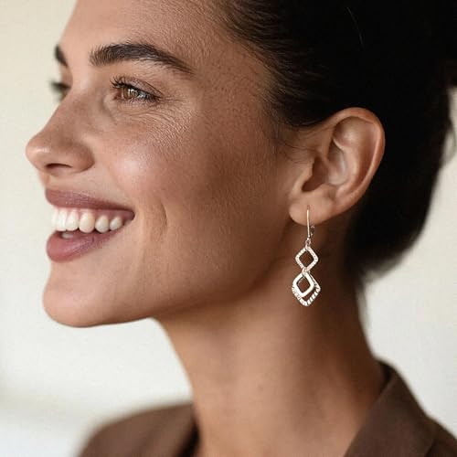• Geometric Elegance with Handcrafted Texture: Featuring three rhombus shapes with artisanal hammered detailing, these silver dangle earrings offer a perfect blend of modern geometry and organic texture for a statement-making look. These unique design dangling modern earrings complement both casual jeans and little black dresses.