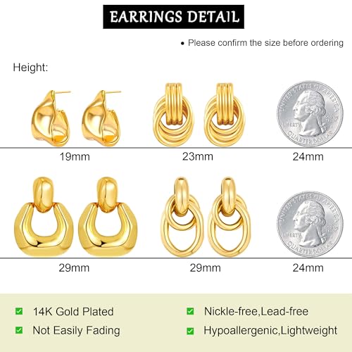 • Gold Earrings for Women Set: You can get 4 pairs dangle earrings in one set, including: Geometric knot earrings, Door knocker earrings, Chunky gold earrings, Gold stud earrings