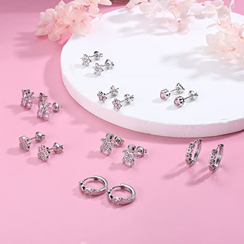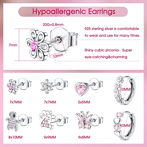 HAIAISO 8 Pairs 925 Sterling Silver Post Stud Earrings Set Hypoallergenic Pink Heart Cz Earrings Cute Butterfly Flower Dog Paw Turtle Stud Earrings Hoops Earrings For Women Over 3 Years Old 3