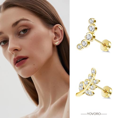 9Pcs 18G 14K Gold 316L Stainless Steel Cartilage Earrings for Women Helix Earrings Dainty Opal Leaf Flat Back Stud Earrings CZ Flower Conch Earrings Piercing Jewelry 6/8MM 2