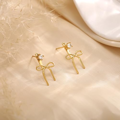 • Gold Bow Design: Dainty gold bow earrings with sparkling diamond , Featuring an innovative earring jacket style, perfect for both casual and dressy occasions.