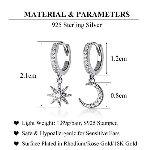 HOT ! SLUYNZ 925 Sterling Silver Sparkling CZ Star Moon Small Hoop Earrings for Women Teens Asymmetric Star Moon Huggie Earrings