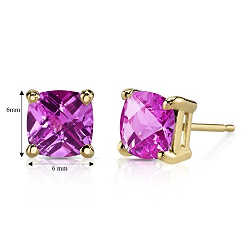 More information about Peora Solid 14K Yellow Gold Created Pink Sapphire Stud Earrings for Women, Classic Solitaire, Hypoallergenic Cushion Cut 6mm, 2.50 Carats total, Friction Back, September Birthstone Earrings,