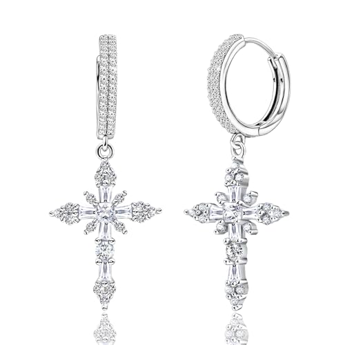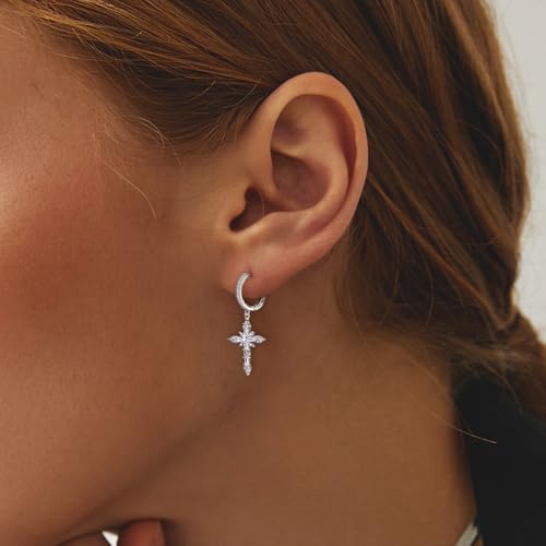 HOT ! Trendy Sterling Silver Huggie Hoop Dangle Pendant Cross Earrings for Women Dainty Cartilage Charms White Gold Plated Hypoallergenic Jewelry Birthday Gift for Women