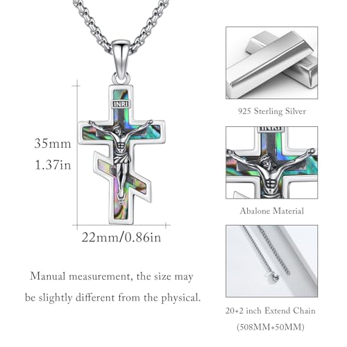 • Prenium Material: Crafted from 925 sterling silver, this crucifix pendant is durable and resistant to tarnish due to an oxidation process. It's beautifully adorned with iridescent abalone shell, adding a natural and unique colorful shimmer to the piece
