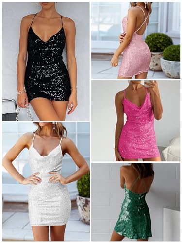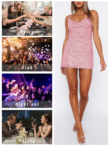 • 【Feature】Cowl neck, square neck, scoop neck, v-neck, open back, high waist, sleeveless, sexy backless, A-line. The spaghetti strap style of this bodycon mini dress shows off your shoulders and neckline, adding a touch of femininity, sexiness and elegance. Short mini dress with sparkling sequin material, slim fit design to show off your sexy curves and create a flattering silhouette that hugs your body and looks amazing.