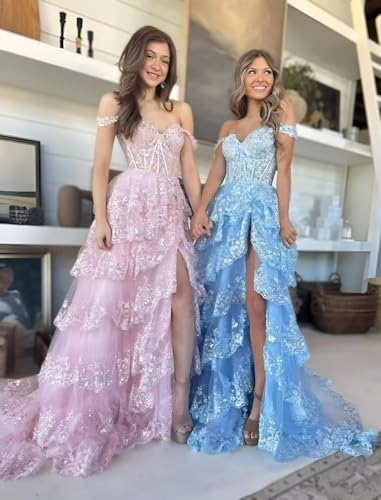 More information about Sparkly Tulle Lace Prom Dresses for Women Teens 2025 Tiered Corset Ball Gown Formal Evening Gowns with Slit