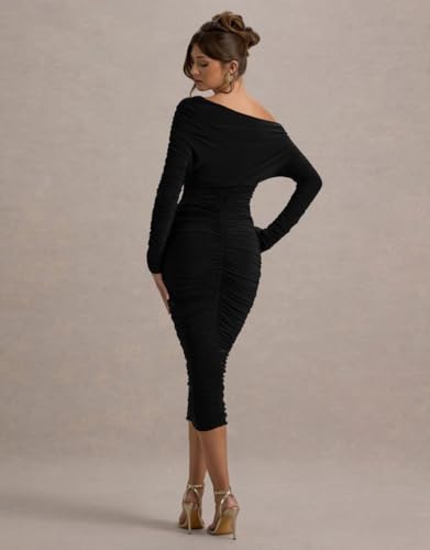 LAGSHIAN Women's Elegant Bodycon Long Sleeve Midi Dress Fall Off The Shoulder Ruched Cocktail Party Dresses 6