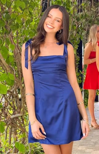 • Features: Silk satin homecoming dress features square neck, spaghetti straps, ruched, tight, bow straps, above the knee, open back,built in bra, fully lined.