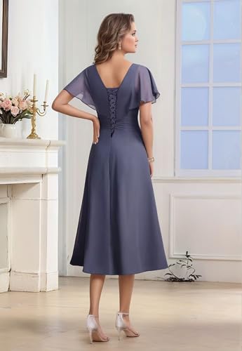Tea Length Mother of The Bride Dresses for Wedding Short Sleeve V Neck Chiffon Formal Evening Gown for Women 4