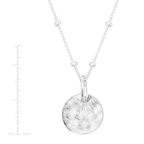• A simple and elegant necklace that will never go out of style! A hammered sterling silver disc is strung along the chain with petite beads. Wear it alone or layer it with other necklaces to create a new trendy look. Piece comes with a ".925" sterling silver quality stamp as a symbol of guaranteed product quality.