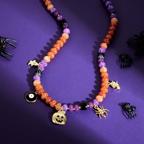 KissYan Halloween Beaded Charm Necklace, Natural Gemstone Choker with 14K Gold Plated Pumpkin Witch Pendant Party Costume Dress Up Jewelry for Women 7